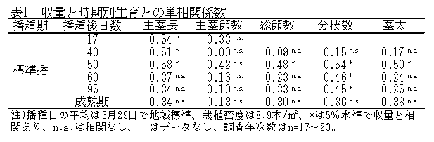 ダイズの収量は播種後50日(開花期約5日前)の生育(主茎長、総節数、分枝数、茎太)と正の相関が高く、また、主茎長では播種後50日以前、分枝数では播種後50日以降にも正の相関が見られる(表1)。収量を高めるには、播種後50日までに生育量を確保し、下位分枝を早期から確保する必要がある。 |