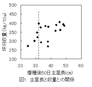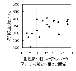 播種後50日の主茎長と分枝数について、主茎長では32cm未満、分枝数では9本/m2未満になると収量が低下するので、生産者実収300kg/10aを想定した多収型の生育指標を目安に生育診断を行う(図1、図2、図3)。 |