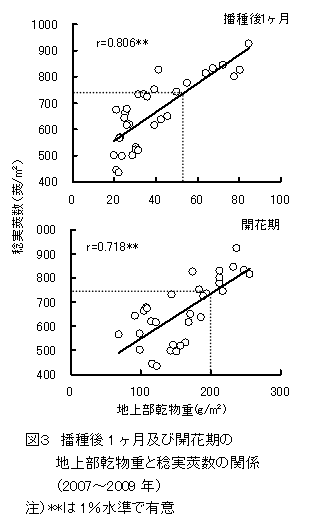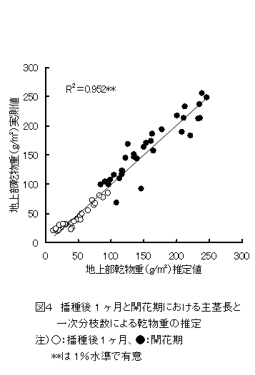 砂質浅耕土地帯におけるダイズ「エンレイ」で400kg/10aの子実重を得るには、稔実莢数が750莢/m2程度必要で、そのためには、地上部乾物重を播種後1ヶ月に50g/m2程度、開花期に200 g/m2程度に誘導する。地上部乾物重は主茎長と一次分枝数で推定できる。 | ||||||