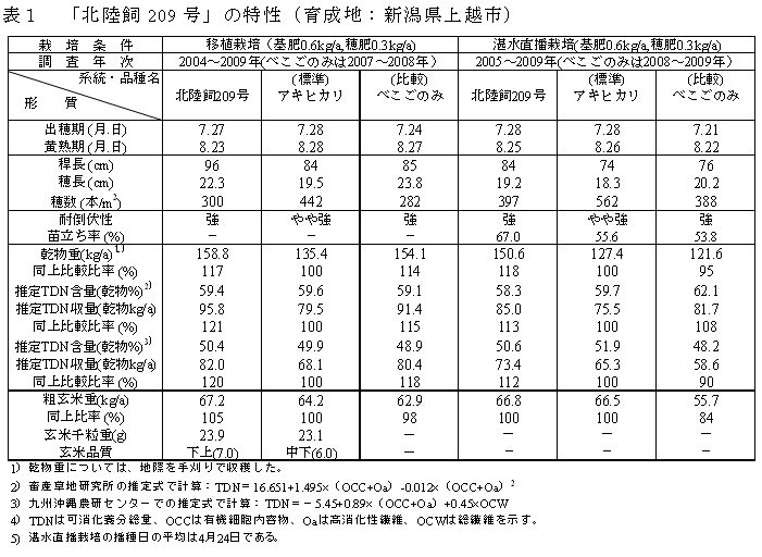 [キーワード]イネ、飼料イネ、極早生、稲発酵粗飼料、新規需要米、多収、北陸飼209号 |