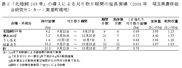「北陸飼209号」は極早生の多収系統で、熟期の異なる稲発酵粗飼料用品種との作期分散による収穫期拡大により、刈り遅れによるサイレージ品質の低下を防ぐことができる。 |