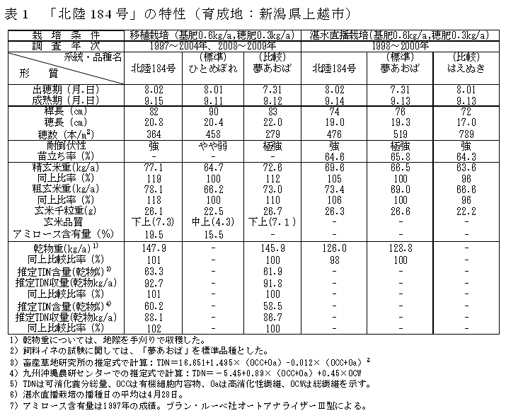 「北陸184号」は寒冷地南部での出穂期が早生の晩に属する粳種である。大粒で玄米収量が多く、バイオエタノール用、飼料用等の新規需要米としての利用が期待できる。 |