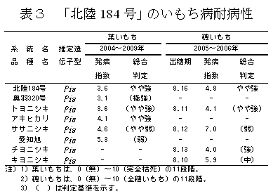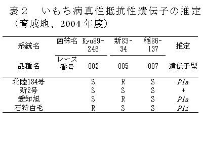 いもち病真性抵抗性遺伝子型はPiaと推定され、我が国の主要ないもち病菌のレースに侵害されるため、当系統から外国稲由来の真性抵抗性遺伝子を侵害する新たなレースが発生する恐れはない(表2)。 |