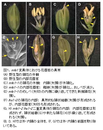 イネの mfo1 変異体は花器官形成にさまざまな異常を生じる。原因遺伝子である MFO1 は、これまで機能不明であったAGL6-like MADSボックス転写因子をコードし、内穎周縁部、鱗被、胚珠の形成を制御するとともに穎花形成の繰り返しを抑制している。 |