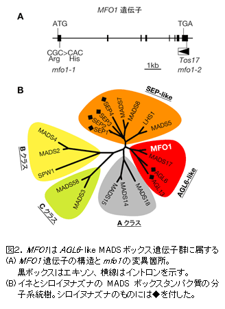 MADSボックス遺伝子群は、塩基配列から推定されるアミノ酸配列により、A、B、C、D、SEP-like、AGL6-likeなどのクラスに分類できる。 MFO1 遺伝子は、イネのMADS17やシロイヌナズナのAGL6、AGL13等の遺伝子とともに、これまで機能未知であったAGL6-like遺伝子群に分類される(図2B)。 |