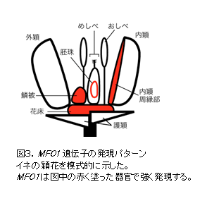 MFO1 は花床、内穎周縁部、鱗被、胚珠の珠皮などで強く発現する(図3)。これらの発現領域は、 mfo1 変異体で形態異常が生じる領域と一致する。 |