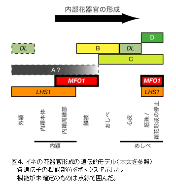 これまで提唱されていたイネの花器官形成モデル(「ABCモデル」)中に、今回解明した MFO1 の役割を当てはめた改訂モデルを図4に示す。 MFO1 は、SPW1を含むBクラスとともに鱗被形成を、また LHS1 とともに内穎周縁部形成を制御する。また MFO1 は、Cクラス、Dクラスおよび LHS1 とともに胚珠形成を制御する。さらに MFO1 は LHS1 とともに、内部花器官形成を誘導し、穎花形成の繰り返しを抑制する。 |