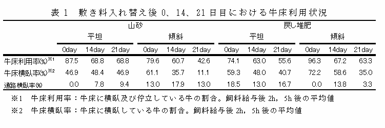 敷料入れ替え直後(0day)では、戻し堆肥・傾斜区の牛床利用率、横臥率がともに極めて高く、通路横臥牛はみられない(表1)。試験14日目においても、牛床横臥率は戻し堆肥・傾斜区が最も高いが、21日目には、牛床の凹凸や堅さに変化の少ない山砂・平坦区以外の3区で牛床利用性が低下する。 |