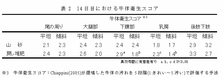 試験14日目の牛体衛生スコア(5段階:1きれい~5汚い)では、戻し堆肥・傾斜区が下腹部及び乳房で戻し堆肥・平坦区よりも有意に低く、山砂の2区よりも低くなる傾向がみられる(表2)。21日目では、14日目でみられたスコアの差は小さくなる。 |