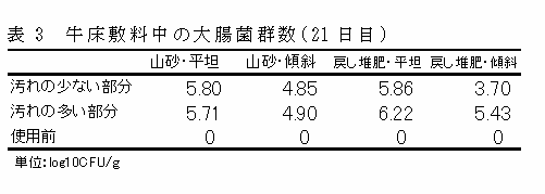 本試験で供した戻し堆肥は、30日以上発酵処理をした水分60%以下のものである。供試敷料(山砂・戻し堆肥)中に大腸菌群は存在していない。 |