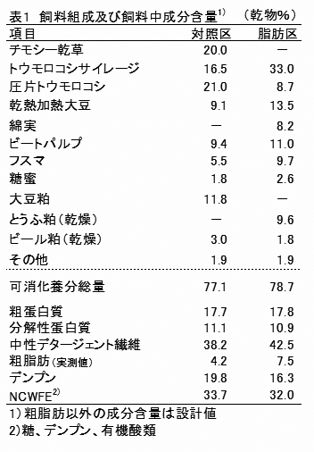 2産以上の泌乳前期のホルスタイン種乳牛24頭(栃木県他3県の試験場)を対照区と脂肪区に分け供試する。対照区には乾物比で輸入チモシー乾草20%、圧片トウモロコシ21%を給与する(粗脂肪含量4.2%)のに対し、脂肪区では輸入チモシー乾草と圧片トウモロコシをトウモロコシサイレージ、乾熱加熱大豆、綿実、トウフ粕およびフスマに置き換え(粗脂肪含量7.5%)(表1)、それぞれTMRとして分娩後15週間給与する。 |