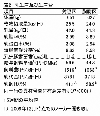 飼料費および乳飼比は脂肪区で低く、対照区と比較して脂肪区では乳飼比を約30%抑えられる(表2)。 |