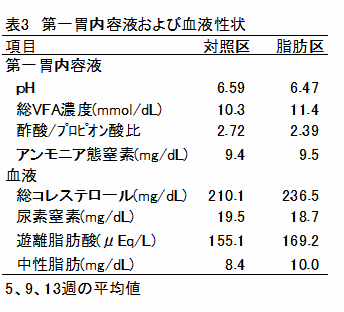 第一胃内容液のpH、総VFA濃度、酢酸/プロピオン酸比、アンモニア態窒素および血液性状は試験区間に差がない(表3)。 |