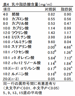 乳中脂肪酸含量は、油実、食品製造副産物を多給し粗脂肪含量を7.5%とした脂肪区でステアリン酸、バクセン酸(tVA)、オレイン酸、リノール酸、αリノレン酸、ルメニン酸(c9t11-CLA)が高い(表4)。 |