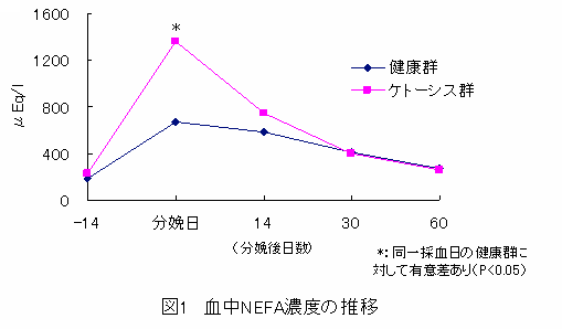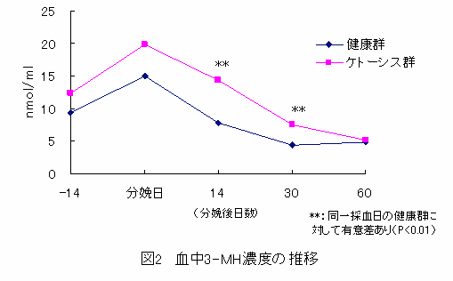 分娩日におけるケトーシス群のNEFAは健康群より高く(P<0.05)、分娩14、30日後における3-MHもケトーシス群で高い(P<0.01)。しかし、他の血液項目では両群間に差はみられない。 |