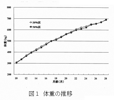 肥育期間中の体重の推移は両区の間に差は認められず、肥育終了時まで同様な発育性を示している(図1)。濃厚飼料、粗飼料摂取量の平均は30%区で4166.7±303.3kgおよび908.7±20.3kg、50%区で4124.8±248.7kgおよび925.8±125.2kgであり両区に差は無い。