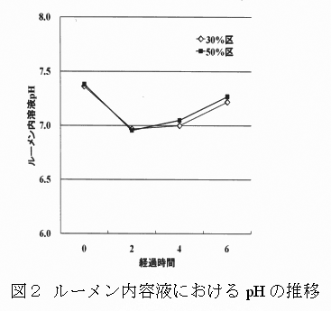 ルーメン内容液のpHは両区とも配合飼料摂取2時間後に最低値を示し、その後は時間の経過とともに上昇している。区間に差はなく同様な推移を示しており、ルーメンアシドーシスの傾向も認められない(図2)。測定は経口採取により実施したためやや高値になったと思われる。測定時の試験牛は14ヶ月齢である。 |