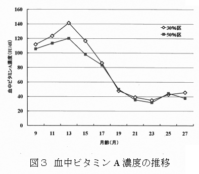 血中ビタミンA濃度は両区とも13ヶ月齢時に最高値となりその後減少している。全期間を通して区間に差は無く同様な推移を示しており、飼料用米を多給してもビタミンAコントロールに問題は無い(図3)。 |
