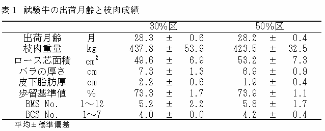 30%区と50%区との間に発育性、枝肉重量とも差はないが一般の通常肥育と比較するとやや小さく、増体面に関しての検討が必要である。 |