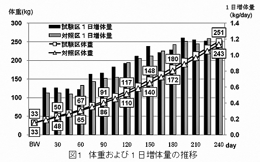 2週間毎に実施した発育性調査から、生後2週から150日にかけて試験区の発育が対照区より良い傾向があり(図1)、試験開始日齢から240日齢までの増体量(+8kg)の改善が認められる(表1)。 |