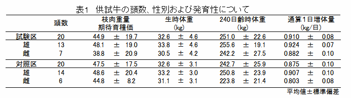 和牛子牛40頭を生年月日、性別、血統、枝肉重量の期待育種価および生時体重を考慮し、生後10日齢でトルトラズリル製剤(抗原虫剤)を投与する試験区と無投与の対照区を設定、同一牛房で同様の飼養管理を実施する。 |
