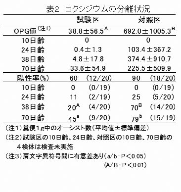 生後10、24、38および70日齢のオーシストの分離状況から、トルトラズリル製剤の発症前投与は子牛のコクシジウムの感染時期を遅らせ、さらに、陽性率や糞便中のオーシスト数も減少させる(表2)。 |