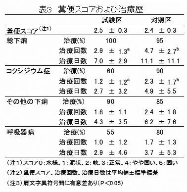 抗コクシジウム剤投与により、コクシジウム症の治療回数は減少する。また、呼吸器病の発生も減少する傾向にある(表3)。 |