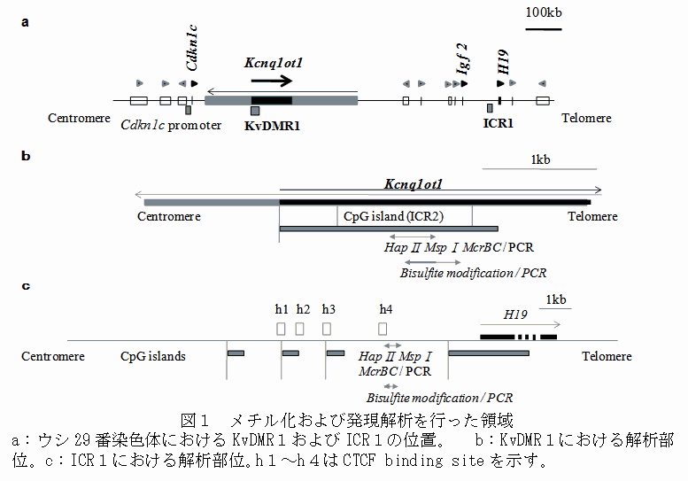 LOSの症状はヒトのBeckwith-Wiedemann症候群(BWS)とよく類似していることから、BWS責任遺伝子(KvDMR1(Cdkn1c/Kcnq1ot1 )ならびにICR1(Igf2/H19 ))に注目し、ウシ29番染色体に存在するKvDMR1およびICR1のCpGメチル化および遺伝子発現の解析を行う。解析を行った領域を図1に示す。 |