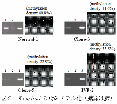 LOSを示した2頭のIVF由来と7頭のNT由来子牛の主要臓器のKvDMR1におけるメチル化解析では、HpaII-MspI-McrBC PCR でIVF由来2頭中1頭、NT由来7頭中2頭はコントロールと比較してKcnq1ot1 のCpGメチル化が低下しており、バイサルファイトシークエンスからも同様の結果が認められる(図2)が、Cdkn1cのプロモーター領域はすべての検体でコントロールと同様のメチル化状態を示す。 |