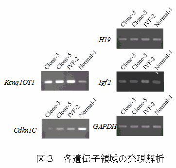 遺伝子発現解析において、RT-PCRではKcnq1ot1 のCpGメチル化が低下している3頭のKcnq1ot1 の発現レベルはコントロールと比較して高く、Cdkn1cの発現レベルはコントロールよりも低い(図3)。また、Kcnq1ot1のCpGメチル化が低下している3頭のうち、NT由来子牛1頭およびと畜場出荷牛1頭のKcnq1ot1 に一塩基多型が認められ、RT-PCR産物のシークエンスでは、NT由来子牛は両アレルとも、と場出荷牛は片アレルのみ発現が認められる。ICR1のメチル化および発現解析では、Igf2 およびH19 はいずれもIVF由来、NT由来およびコントロールで差を認められない。 |