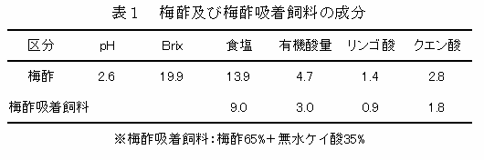 梅酢には有機酸が約5%、食塩が約14%含まれており(表1)、肉用鶏飼料に添加されている食塩を代替(食塩が0.36%添加されている場合、その代替として梅酢を2.6%程度添加可能)することができる。 |