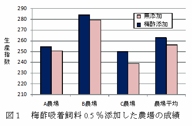 飼料に梅酢吸着飼料0.5%を添加の費用は、500円/トンである。 |