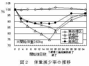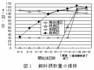 飽食区の飼料摂取量は、換羽飼料に慣れるにつれて増加する(図1)。一方、飽食区の体重は換羽飼料に慣れるにつれて減少率が緩やかになり、絶食区及び制限区よりも減少率が小さい(図2)。 |