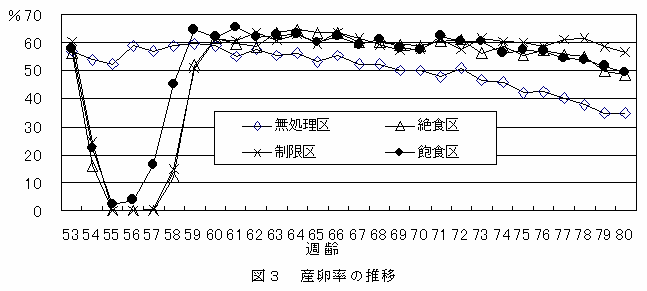 産卵率は、絶食区、制限区、飽食区すべてで休産し、飽食区の再産卵の立ち上がりは絶食区及び制限区よりも早い。休産後は、飽食区は無処理区より高く、かつ絶食区、制限区と同等に推移する(図3)。 |