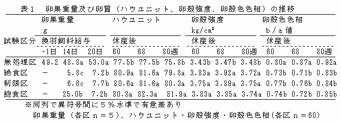 卵巣重量は、14日目、20日目とも絶食区、制限区、飽食区すべてで無処理区に対し、有意に軽くなり、生殖器の萎縮が確認される(表1)。休産後の卵質は、絶食区、制限区、飽食区すべてでハウユニット、卵殻強度、卵殻色色相(b/a値)ともに、無処理区より優れて推移し、飽食区は絶食区、制限区と同等の効果が確認される(表1)。 |