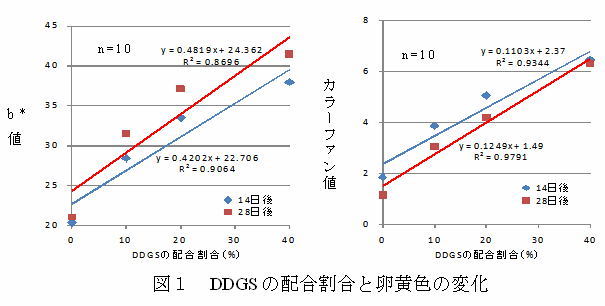 試験飼料を採卵鶏(ジュリア、28週齢、各10羽)に給与開始後、14及び28日後に卵黄色を調査すると、色差計による測定では、DDGSの配合割合が増加するのに伴い、b*値が上昇し黄色が濃くなり、カラーファン値も上昇する(図1)。 |