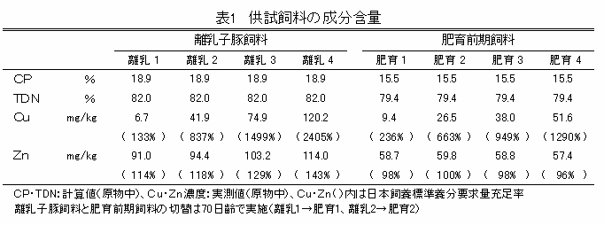 ふん中の銅・亜鉛濃度は、離乳子豚期52~55日齢および肥育前期87~90日齢のふんを部分採取して60℃2日間乾燥したふん4日分を混合、粉砕して、乾式灰化後に原子吸光法により分析した値である。 |