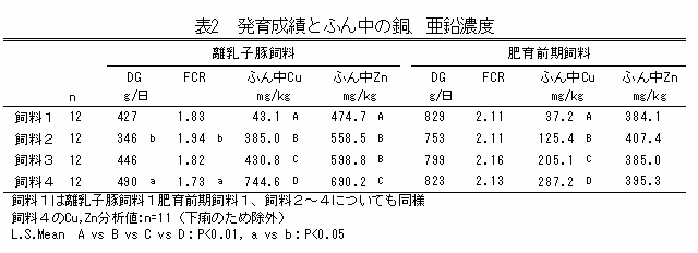 ふん中の銅・亜鉛濃度は、離乳子豚期、肥育前期ともに水準間に有意な差を認め、飼料中の銅・亜鉛含量との関係で、正の直線回帰式(P<0.01)が得られる(表2、図1)。 |