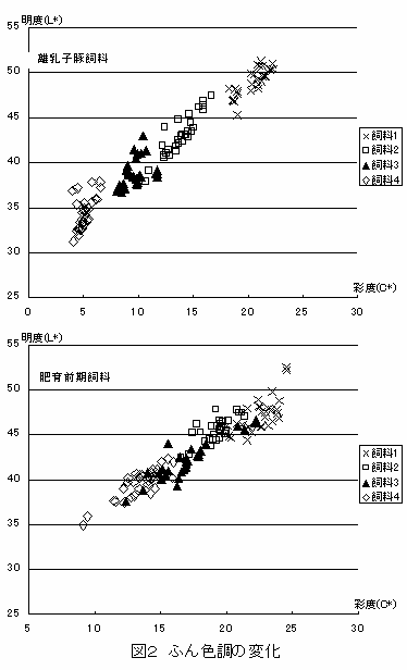 離乳子豚期46~55日齢および肥育前期81~90日齢に分光色差計により測定した生ふんの明度(L*値)、色度(a*値、b*値)は、ふん中銅・亜鉛濃度の増加により低下して、色調は茶色から黒色、暗い方向に変化するが、ふん中の亜鉛濃度に差がなくても明度、色度の低下を認め、ふん中の銅濃度が強く影響することが示唆される(図2)。 |
