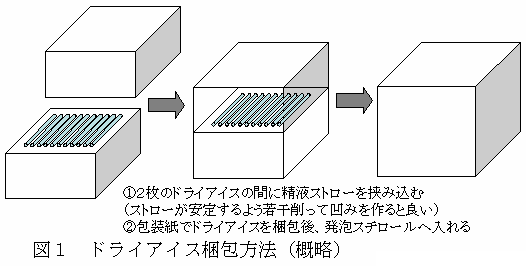 2個のドライアイス(約20cm x15cm x 2.5cm(約1kg強))のうち1個に凹み(約0.5cm x14cm x 0.5cm)を(10本)作り、凍結精液(10本)が入った0.5mlストローを挟み込み、さらに包装紙等で全体を包んだ後、発泡スチロール箱へこの包みを入れることにより、融解させることなく凍結精液を1日程度保持できる(図1)。 |