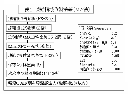 MA法(メチルアセトアミドの最終濃度9%、表1)で凍結した「八木戸」(三重県原産シャモ)の凍結精液において、上記方法で梱包し、1日保持した後に融解した区(ドライアイス梱包区)と液体窒素タンク内から取り出した直後に融解した区(液体窒素内保存区)を比較した結果、ドライアイス梱包区の活力(50++)は、液体窒素保存区(60++)よりも低いが、受精能力は同等とみなされる。 |