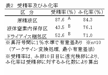 ドライアイス梱包区と液体窒素保存区の凍結精液及び液状精液を白色レグホン(10羽)に人工授精を行い(表1)、15日間にわたり採取した種卵の受精率とふ化率を比較した結果、これら2区では同等な成績が得られている(図2、表2)。なお、比較のため、採取後リン酸緩衝液で4倍希釈した精液を直ちに人工授精した区(原精液区)でも同様な試験を実施している。 |