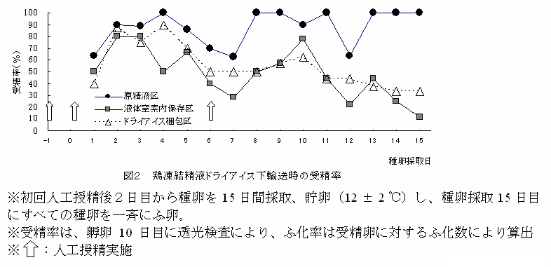 以上のように、ドライアイスによる梱包を工夫することにより、ドライアイス下での鶏凍結精液を1日保持しても、受精率及びふ化率を低下させず、液体窒素内に保存した凍結精液と遜色ない成績を示すことから、翌日着の宅配便等によるドライアイスを利用した簡易な鶏凍結精液の輸送が可能である。 |