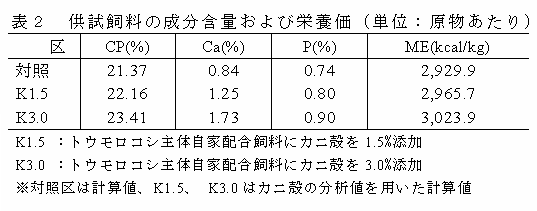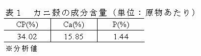 トウモロコシ主体自家配合飼料にカニ殻を添加すると、添加割合が高まるにつれ、粗蛋白質(CP)、代謝エネルギー(ME)、カルシウム(Ca)、リン(P)ともに増加する(表1、表2)。 |