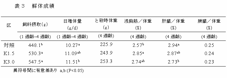 カニ殻添加により、飼料摂取量・日増体量(DG)が高くなり、浅胸筋重量比においては、カニ殻添加区は対照区と比べ高い値を示し、肝臓重量比は低い値を示す(表3)。 |