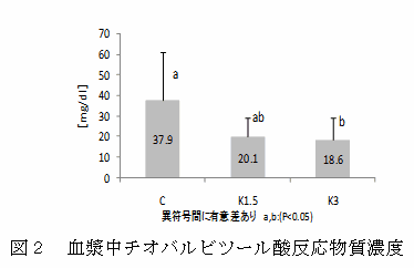 脂質酸化の指標である血漿中チオバルビツール酸反応物質(TBARS)濃度は、カニ殻3%添加により、対照区と比べ低い値を示す(図2)。 |