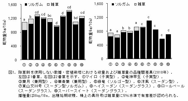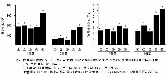 以上の結果から茎数が十分確保でき、草丈の伸長速度が速いスーダン型およびスーダングラスに属する品種は、雑草との競合力が強く、除草剤を使用しない散播・密植栽培の適性が高い。これに対し、2番草茎数が少なく、草丈の伸長速度が遅い子実型およびソルゴー型ソルガムに属する品種は本栽培の適性が低い。 |