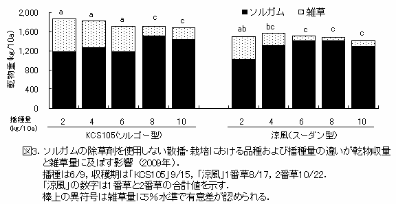 雑草発生量の少ないスーダン型ソルガム品種「涼風」では、播種量が6kgの場合でも収穫時の雑草量が少ない(図3)。 |