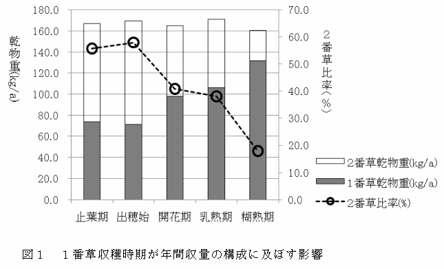 1番草の刈り取り時期が遅れると、2番草の出穂期が遅れ、乾物率が低下し、収穫時の気温が低下して、予乾時間が増加するため作業性に影響する。 |