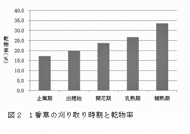 1番草の乾物率は刈り取り時期が遅れるほど高くなる。止葉期には17%であるが、糊熟期には30%を越える(図2)。 |
